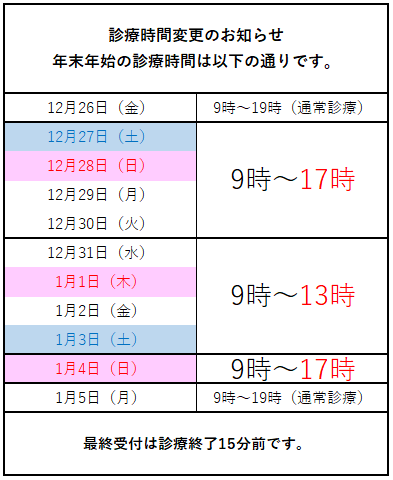 予防接種の受付は、診療終了の1時間前までとさせていただきます。