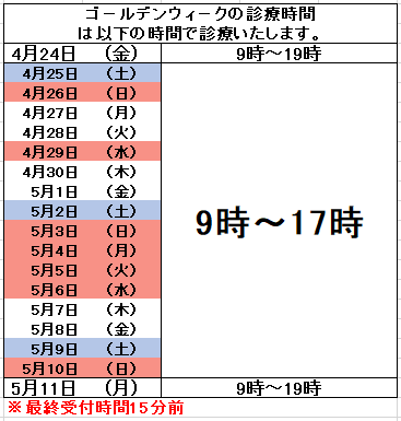 - 2026.3.20 ゴールデンウィークの診療時間についてお知らせをクリニックからのお知らせに載せました。ご確認ください。