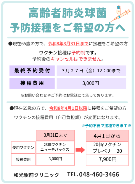 - 2026.3.21 高齢者肺炎球菌予防接種をご希望の方へのご案内をクリニックからのお知らせに載せました。ご確認ください。